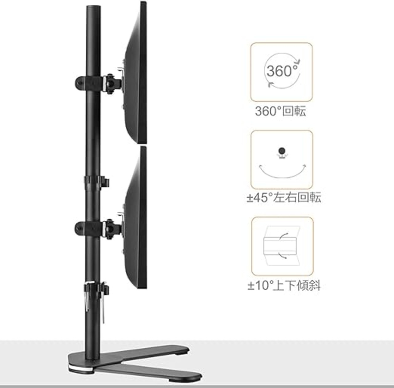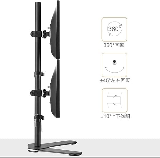 【ディスプレイ角度を自由に変えれる】①アーム:ポールの接続部分移動で高さ調節(810mm) ②VESAプレート部:上向き10°、下向き10°、回転360°、左右各45°。角度や距離などが自分に合って、前後左右に加えて上下も好みの位置に軽々と動かすことができます。ビジネスでの利用はもちろん、トレーダーやゲーマーの方にもおすすめです。 ご注意:付属の六角レンチでボルトを締めて傾斜角度を固定します。一方のモニターが低い場合は、ナットを取り外し、付属の六角レンチでボルトを反時計回りに回してモニターを上げます。調整後、ナットを取り付けます。