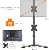 【対応モニター】液晶モニターを2画面設置できるデュアルディスプレイアームです。耐荷重は10KG(1台)で、VESA規格は75×75mm/100×100mmで、13~32インチPCモニターに対応します。