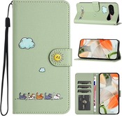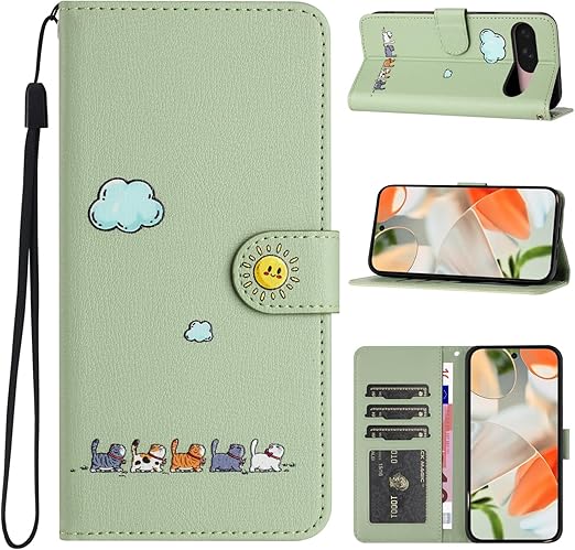 CASAFUNY Google Pixel 9/Pixel 9 Pro ケース 手帳型 通用 おしゃれ カバー google ピクセル 9 プロ/ピクセル9 ケース 手帳型 人気 可愛い猫柄 保護カバー pixel9 ケース 手帳型 耐衝撃 PUレザー 携帯カバー googleピクセル9 ケース お洒落 pixel9ケース マグネット式 カード収納 スタンド機能(6.24インチ)ライトグリーン1