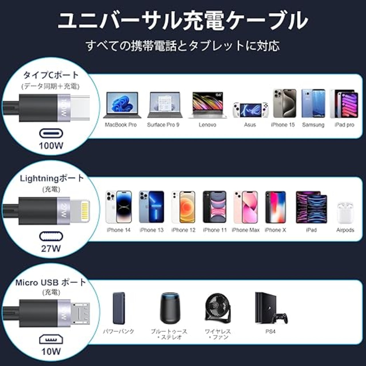 ?【3台同時充電】高速充電ケーブルにはType-C(100W)、Lig