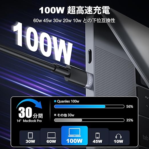 ?【最大100Wの高速充電】PD 3.0/2.0、QC 3.0/2.0の高速充電プロトコルと完全に互換性があります。この急速充電ケーブルは5V、12V、20Vの電力で最大5Aの電流をサポートし、高速充電を実現します。USB PD充電器を使用すれば、MacBook Pro S22を45分で50%、iPhone15を71%まで充電できます。 注:理想的な急速充電効果を得るためには、60W以上の充電器を使用することをお勧めします。