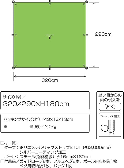 キャプテンスタッグ(CAPTAIN STAG) タープ レクタタープ セット 320×290cm UVカット 2000mm防水 【2~3人用】 バッグ付き トレッカー 【ホワイト/グリーン/カーキ】 UA-1083/UA-1085/UA-108911