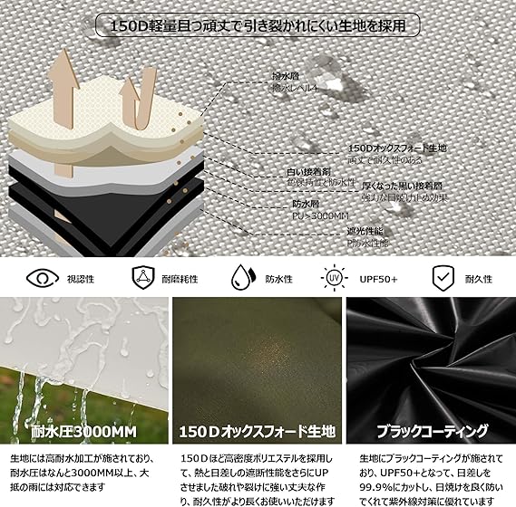 【革新的なブラックガム塗層加工】耐久性が高く、ブラックガム塗層を加工して、普通のタープより、紫外線カット率99.9%になりました。この特殊なコーティングにより、タープは長期間の使用にも耐え、劣化しにくくなっています。夏には陽射を遮り、タープの下で皆がストーブを囲んで暖を取ることやバーベキューをして快適です。 春夏秋冬を問わずご利用いただけ、アウトドア体験をより快適にします。