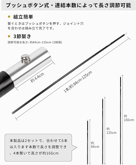 分割式ポール:分割式の3節/4節連結との2種類からご選択できます。3節連結タイプの長さ調整範囲は83cm~125cmまで、41cmごとにご調節可能です、(また