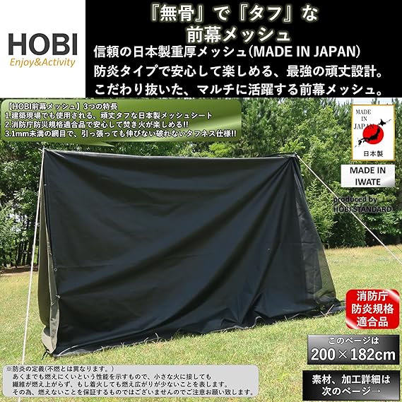 HOBI 前幕メッシュ200【日本製】200×182cm 消防庁防炎規格適合品 [無骨でタフ] 頑丈ハトメ8カ所 軍幕 横幕 スクリーン 砂よけ 日よけ タープ キャンプ アウトドア レジャー ホビ ブラック [MADE IN JAPAN]11