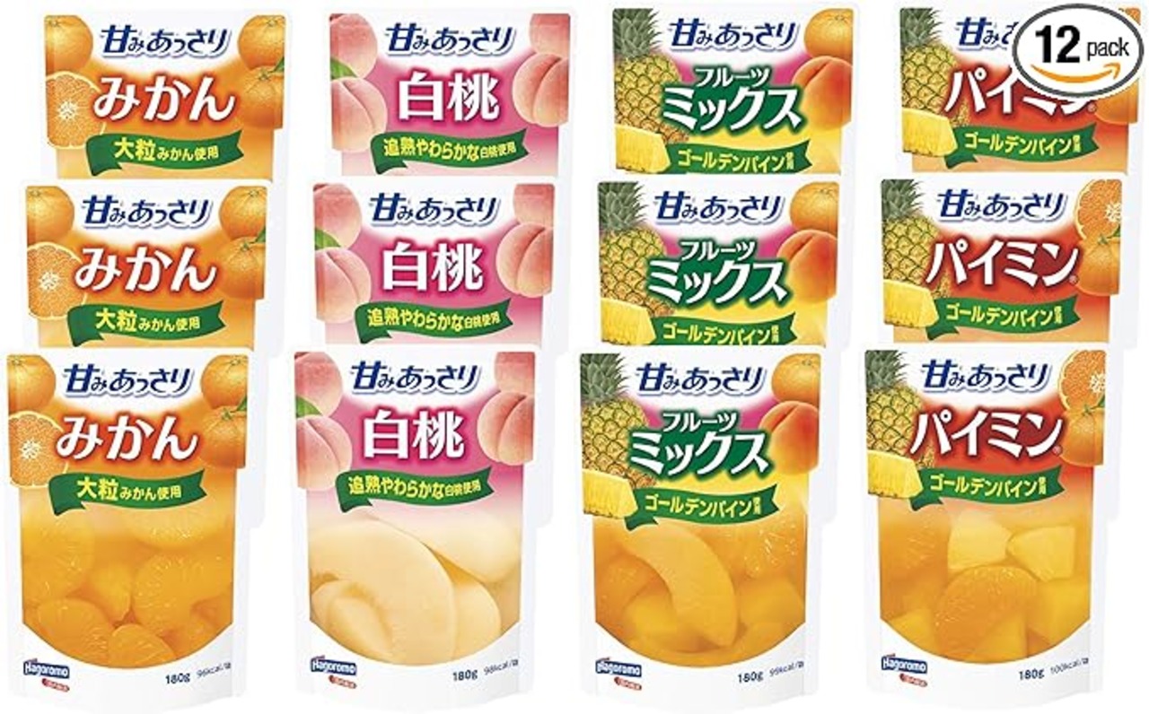 【セット内容】甘みあっさりみかん(パウチ)180g×3袋、甘みあっさり白桃(パウチ)180g×3袋、甘みあっさりミックス(パウチ)180g×3袋、甘みあっさりパイミン(パウチ)180g×3袋