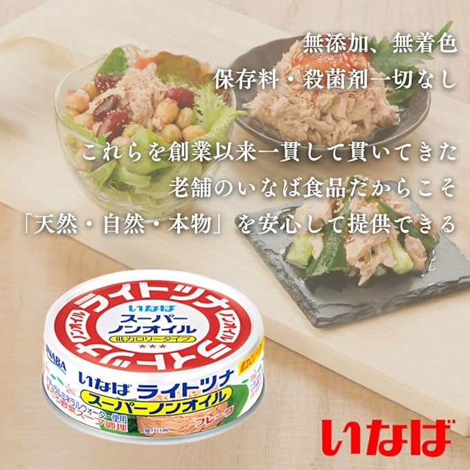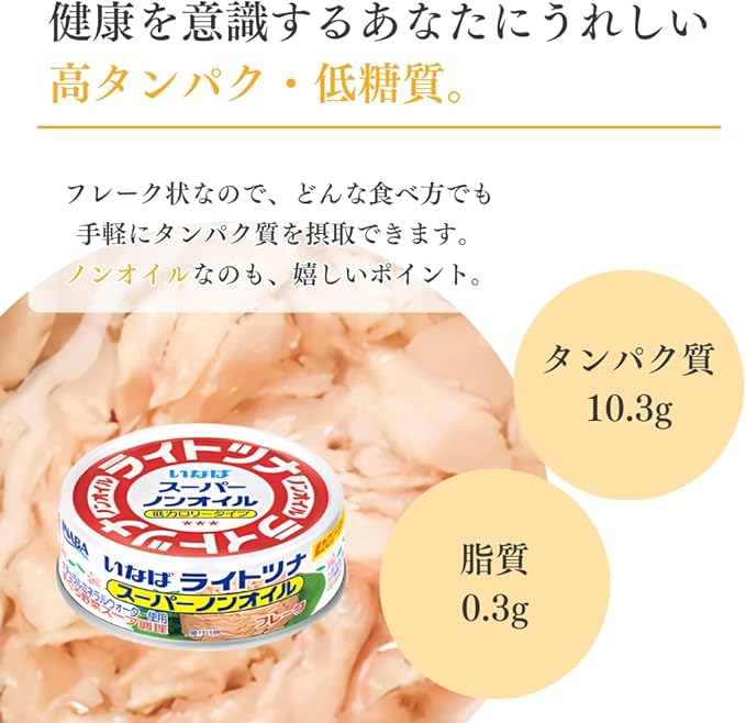 料理の定番、いなばのライトツナスーパーノンオイル。オイル不使用でヘルシーなツナ水煮缶です。一般的な油漬のツナに比べカロリーは約1/4で低カロリー。