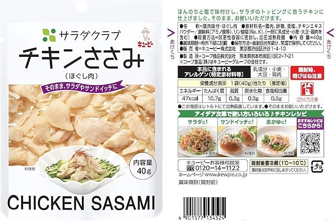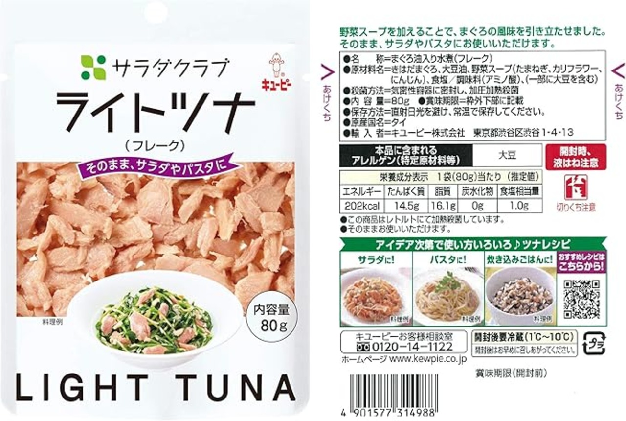 原材料:【チキンささみ】鶏肉、砂糖、食塩、チキンエキスパウダー/調味料(アミノ酸等)、リン酸塩(Na、K)、(一部に乳成分・小麦・大豆・鶏肉を含む)【ライトツナ】きはだまぐろ、大豆油、野菜スープ(たまねぎ、カリフラワー、にんじん)、食塩/調味料(アミノ酸)、(一部に大豆を含む)
