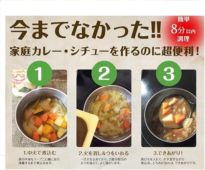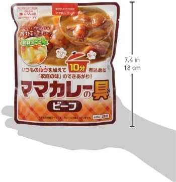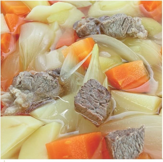 原材料:野菜(たまねぎ、じゃがいも、にんじん)、牛肉、チキンブイヨン、酵母エキス、食塩