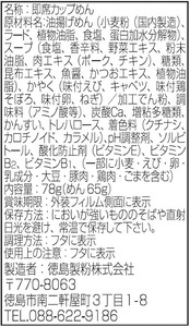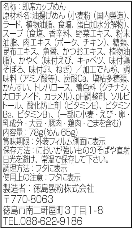 原材料:油揚げめん(小麦粉(国内製造)、ラード、植物油脂、食塩、蛋白加水分解物)、スープ(食塩、香辛料、野菜エキス、粉末油脂、肉エキス(ポーク、チキン)、糖類、昆布エキス、魚醤、かつおエキス、植物油脂)、かやく(味付えび、キャベツ、味付鶏そぼろ、味付卵、ねぎ)/加工でん粉、調味料(アミノ酸等)、炭酸Ca、増粘多糖類、かんすい、トレハロース、着色料(クチナシ、カロチノイド、カラメル)、pH調整剤、ソルビトール、酸化防止剤(ビタミンE)、ビタミンB2、ビタミンB1、(一部に小麦・えび・卵・乳成分・大