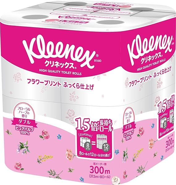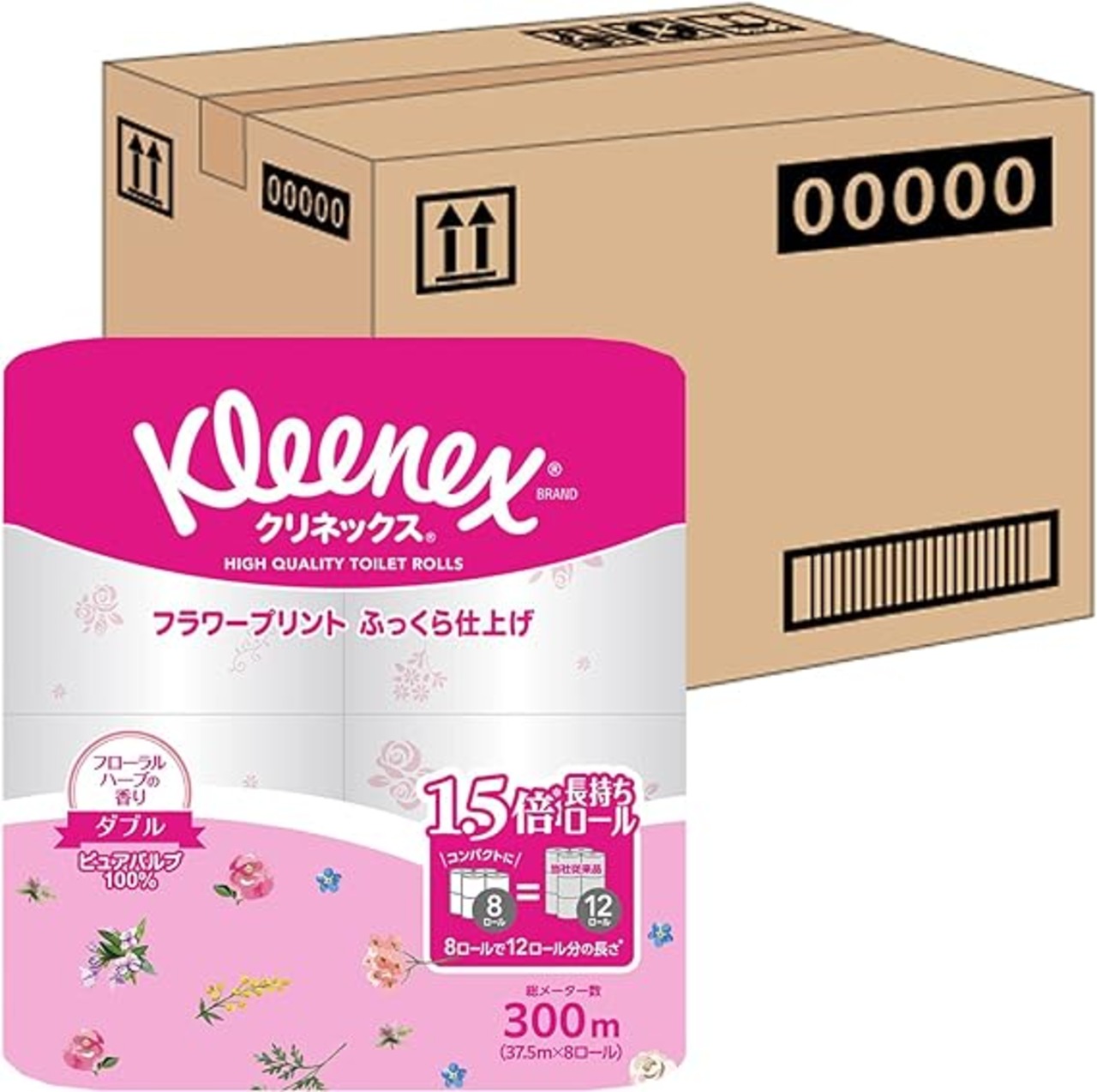 【ケース販売】 クリネックス プリント 長持ち(8ロールで12ロール分)トイレット 37.5mダブル フローラルハーブの香り ×8パック入り1