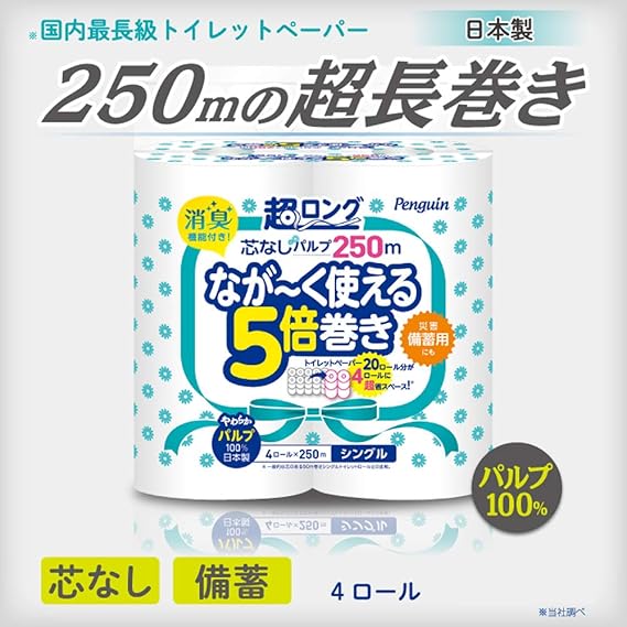 【ケース販売】トイレットペーパー ペンギン 芯なし 超ロング 5倍巻き シングル 250mパルプ 4ロール×8パック 丸富製紙 27951