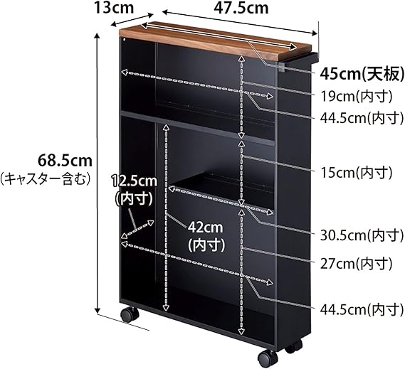 内寸:【下段】約W12.5×D44.5×H27cm 【中段】約W12.5×D30.5×H15cm 【上段】約W12.5×D44.5×H19cm 【下段~中段】約W12.5×D13×H42cm 【天板サイズ】約W13×45cm