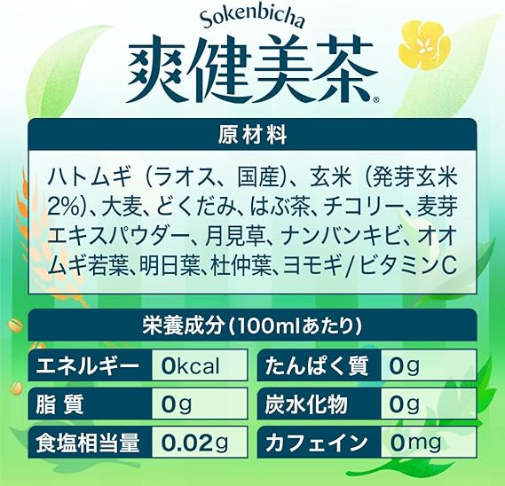原材料:ハトムギ、玄米(発芽玄米2%)、大麦、どくだみ、はぶ茶、チコリー、月見草、ナンバンキビ、オオムギ若葉、明日葉、黒ごま、ヨモギ、ビタミンC