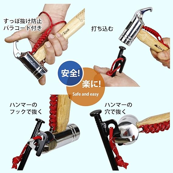 ペグ抜き穴、フックでどんなペグでも快適に抜けます。ペグ打ちペグ抜きをこれ1本で可能です。ハンドルはしっかり握れる木製です。打撃時の衝撃を緩和します。