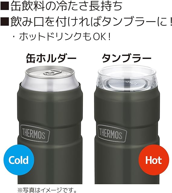 サーモス アウトドアシリーズの保冷缶ホルダー。飲み口を付ければタンブラーとしても使える2wayタイプ。
