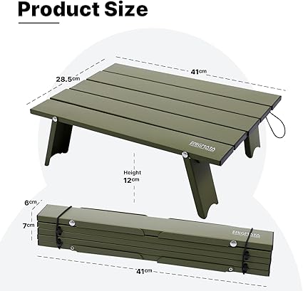 【 ENIGMATA Camping Table 】重量:500g 耐荷重:25kg 使用時サイズ:約41×28.5×高さ12cm 折りたたみサイズ:6×7×41CM 収納袋のサイズ:約51×13.5cm (測量方法により、若干の誤差が出る可能性があります。ご了承ください。) 材質:テーブル本体:アルミニウム合金 付属品:収納袋