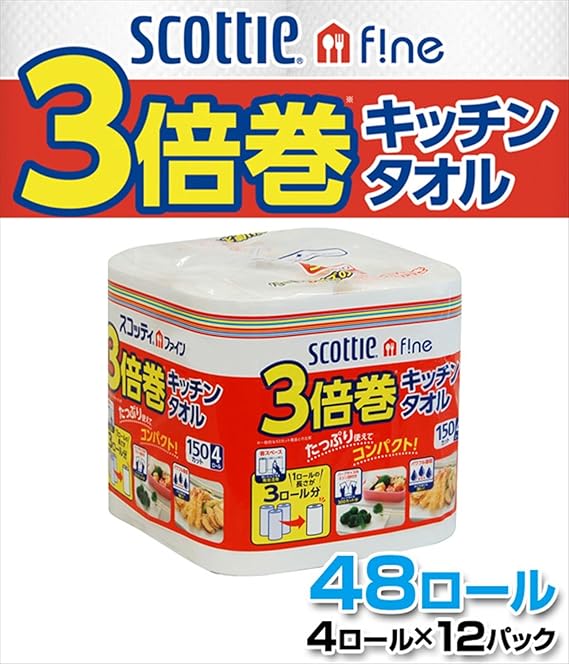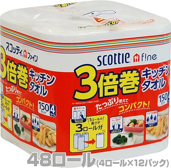 日本製紙クレシア スコッティファイン 3倍巻 キッチンタオル 150カット 4ロール×12パック(48ロール) 332401