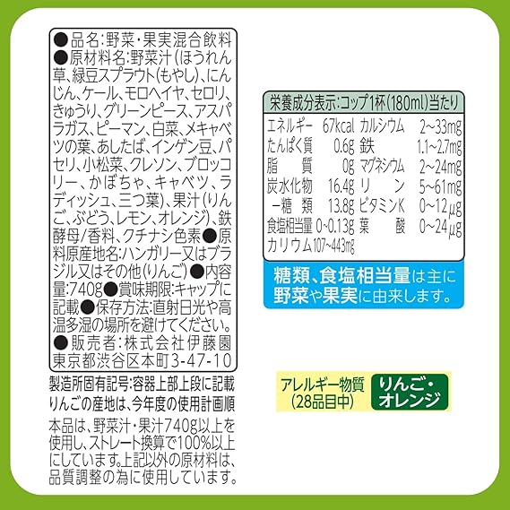 原材料:野菜汁(ほうれん草、緑豆スプラウト(もやし)、にんじん、ケール、モロヘイヤ、セロリ、きゅうり、グリーンピース、アスパラガス、ピーマン、白菜、メキャベツの葉、あしたば、インゲン豆、パセリ、小松菜、クレソン、ブロッコリー、かぼちゃ、キャベツ、ラディッシュ、三つ葉)、果汁(りんご、ぶどう、レモン、オレンジ)、鉄酵母/香料、クチナシ色素 原料原産地:ハンガリー又はブラジル又はその他(りんご)