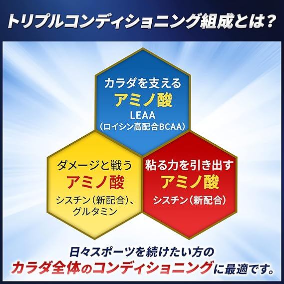 全9種類の必須アミノ酸(EAA)が3800mg配合された、スポーツサプリメントです。日々スポーツを続けたい方のカラダ全体のコンディショニングにぴったりです。