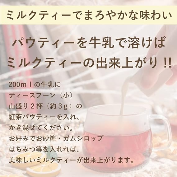 【溶かすだけで美味しいストレートティー】お茶本来の旨みが味わえるインスタントの紅茶です。濃厚パウダー製法によって、お茶本来の旨みや風味が詰まった顆粒状に仕上げ、お水やお湯を注ぐだけで簡単に溶けて、手間がいらないのが魅力です。