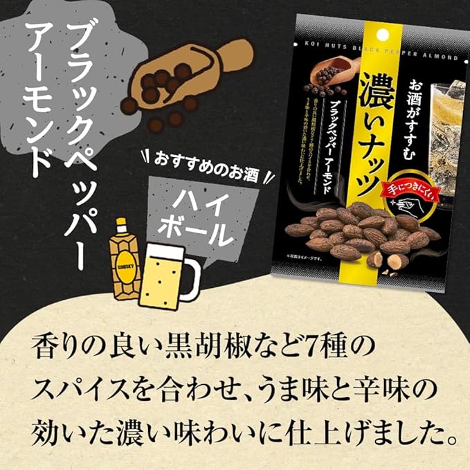 <ブラックペッパーアーモンド>香りの良い黒胡椒など7種のスパイスを合わせ、うま味と辛味の聞いた味わいに仕上げました。おすすめのお酒はハイボール。