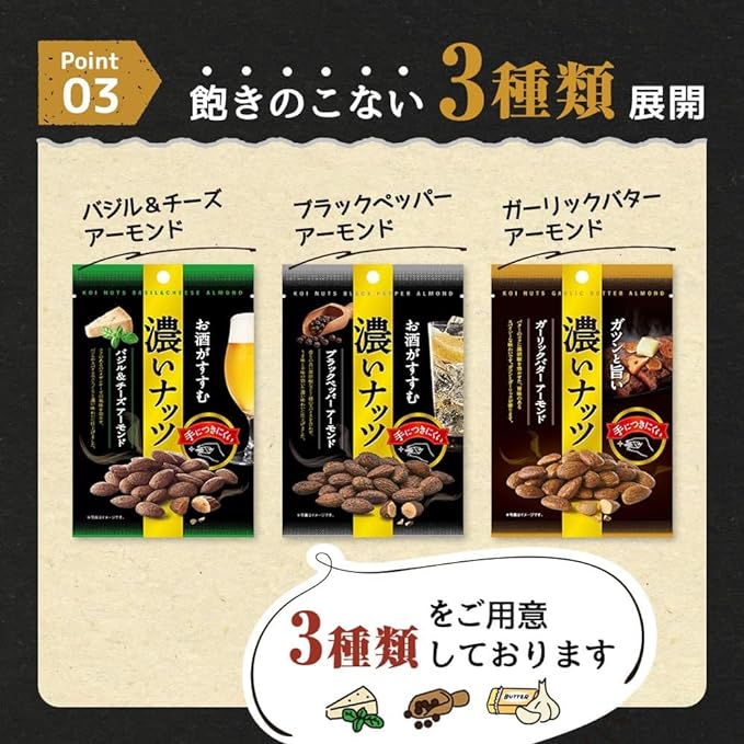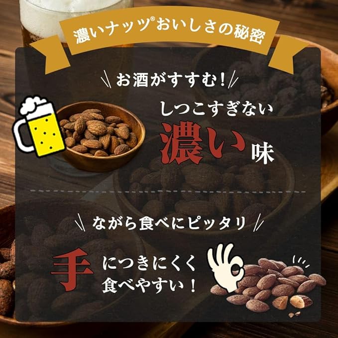 出張帰りの新幹線での1杯が楽しみな開発部長から生まれた、おつまみナッツです。手につきにくい工夫をしているので、スマートフォンやゲーム、テレビのリモコンを触ってもきになりにくい。しつこすぎない濃い味で、お酒もゴクゴク進みます。