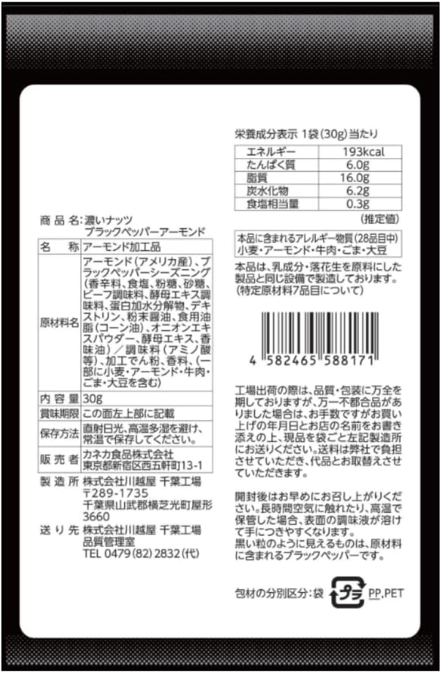種類別名称:アーモンド加工品 アレルギー物質(28品目中):小麦・アーモンド・牛肉