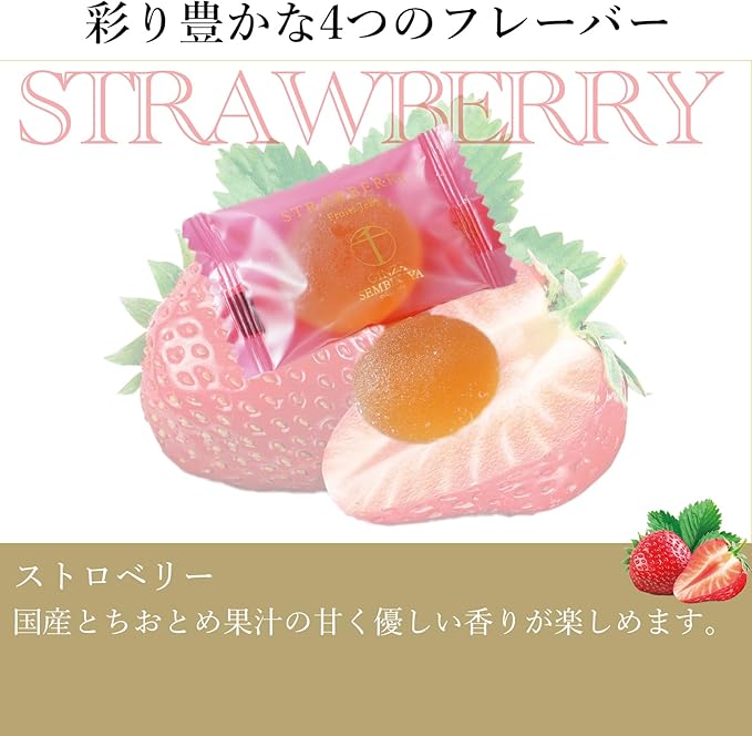 ■原材料:【白桃(ピーチ)】水あめ、麦芽糖、砂糖、桃濃縮果汁、粉末オブラート、ソルビトール、ゲル化剤(ペクチン)、酸味料、光沢剤、香料、乳化剤 【とちおとめ(ストロベリー)】水あめ、麦芽糖、砂糖、いちご濃縮果汁、粉末オブラート、ソルビトール、ゲル化剤(ペクチン)、酸味料、光沢剤、香料、乳化剤、アカダイコン色素 【メロン】水あめ、麦芽糖、砂糖、メロンピューレ、粉末オブラート、ソルビトール、ゲル化剤(ペクチン
