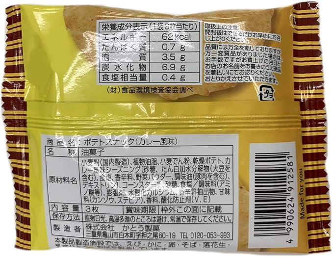 原材料:小麦粉(国内製造)、植物油脂、小麦でん粉、乾燥ポテト、カレー風味シーズニング〔砂糖、たん白加水分解物(大豆を含む)、食塩、香辛料、野菜パウダー、調味油(豚肉を含む)、デキストリン〕、コーンスターチ、砂糖、食塩/調味料(アミノ酸等)、膨張剤、水酸化カルシウム、香辛料抽出物、甘味料(カンゾウ、ステビア)、香料、酸化防止剤(V.E)