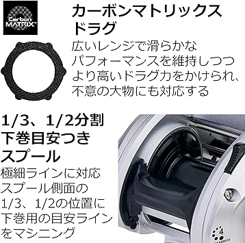 自重(g)233g●ギア比7.0 : 1●最大ライン巻取(cm)73cm●最大ドラグ力(Kg)5kg●ラインキャパシティPEライン(m)1号 - 300m●ラインキャパシティPEライン(m)1.5号 - 200m●ボール/ローラーベアリング3+1●ハンドル長(mm)105mm