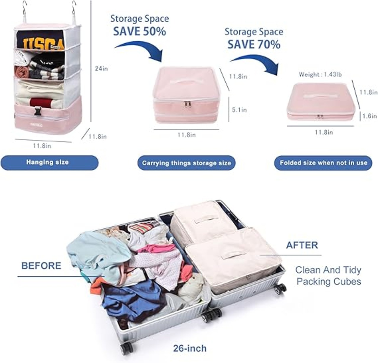 TABITORA(タビトラ)収納ボックス 吊り下げ インナーバッグ 衣類ラック 収納 旅行 出張 クローゼット 省スペース 大容量 衣装ケース 4段 オーガナイザー ピンク L