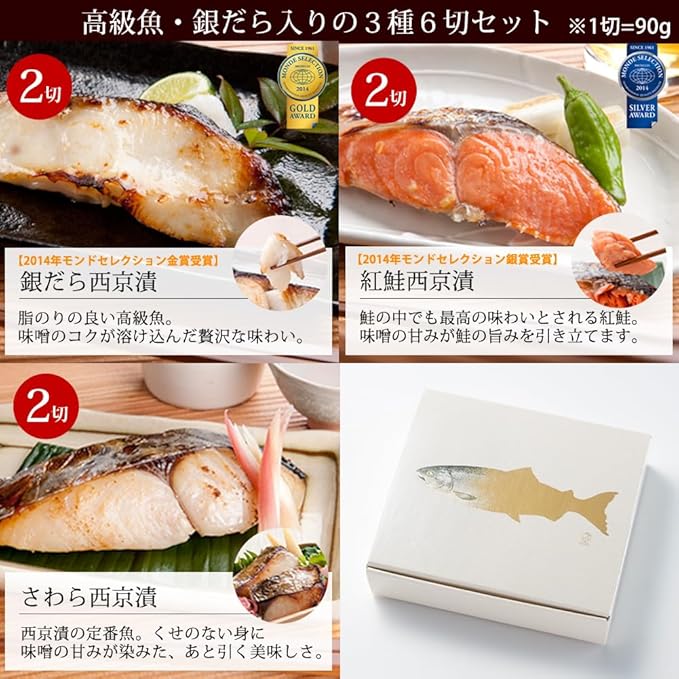 ■セット内容:西京漬(銀だら・紅鮭・さわらx各2) ※1切=90g