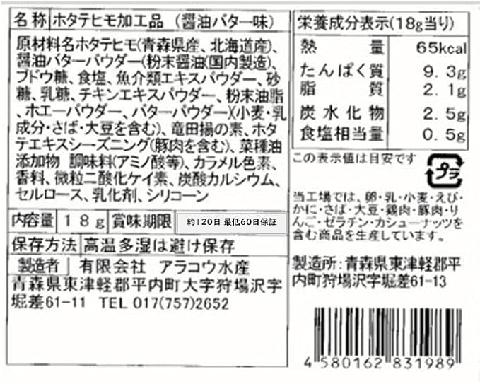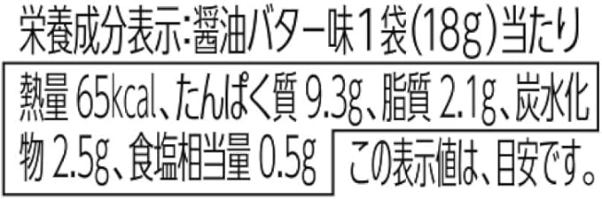 ?油バター味:栄養成分表示:18g当り カロリー65kcal・タンパク質 9.3g・脂質2.1g・炭水化