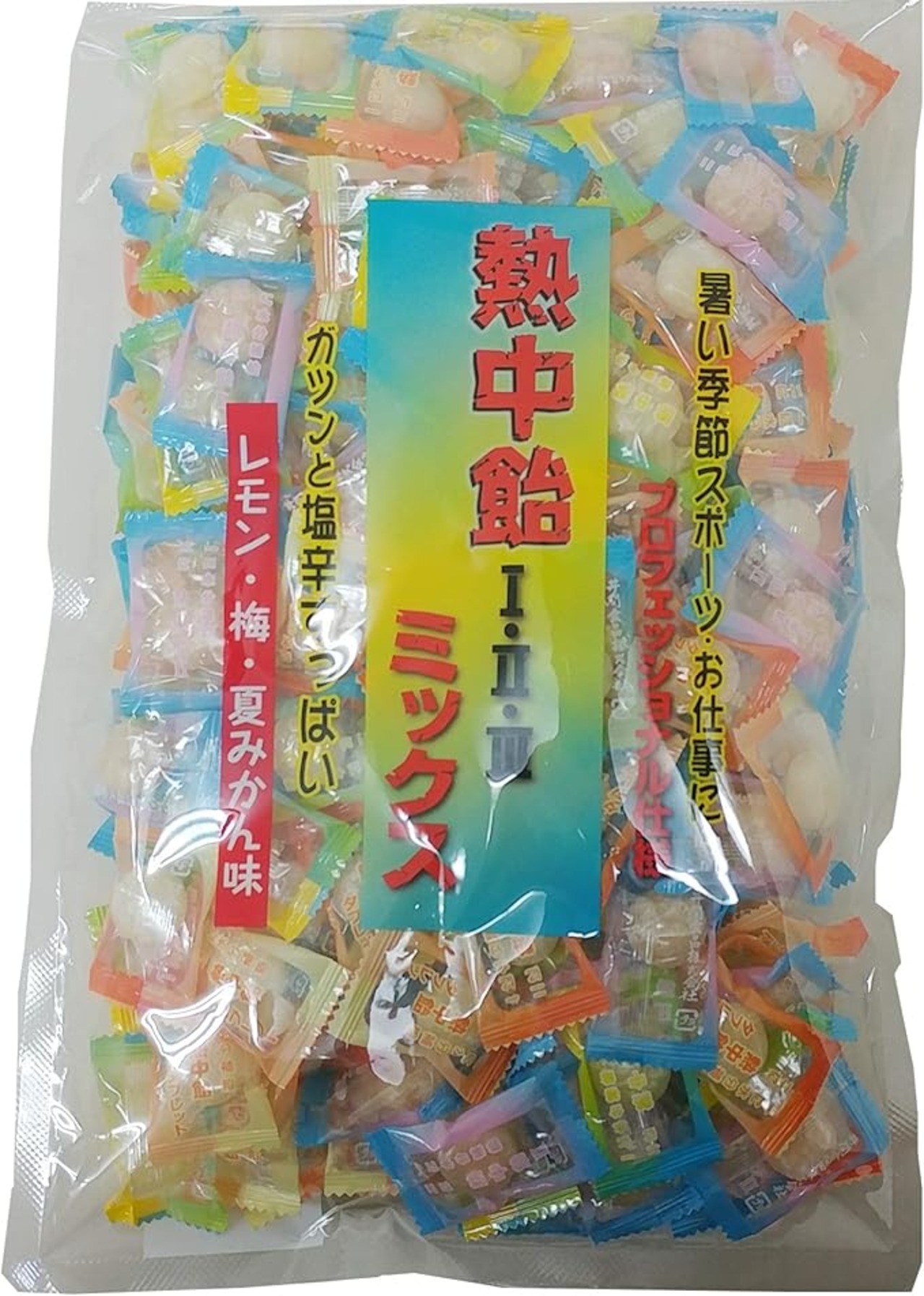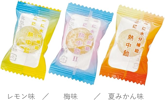 原材料:(熱中飴Iレモン味)砂糖、水飴、塩/クエン酸、香料 (熱中飴II梅味)砂糖、水飴、塩/クエン酸、香料、紅こうじ色素 (熱中飴III夏みかん味)砂糖、水飴、塩/クエン酸、香料