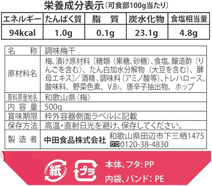 中田食品 紀州南高梅 梅なでしこ 塩分5% 500g1