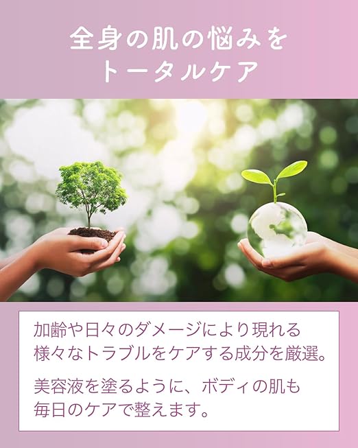 加齢や日々のダメージにより現れるあらゆるトラブルをケアする成分を厳選。 ボディの肌にも美容液を塗るように、毎日のケアで若々しい印象に整えます。