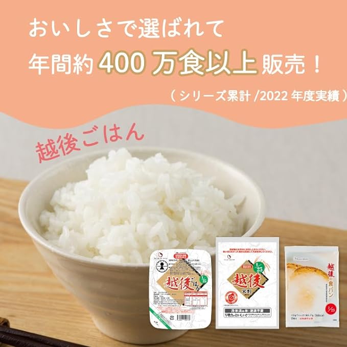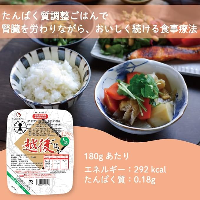 植物性乳酸菌の発酵技術によりお米のたんぱく質を低減させた越後シリーズ。たんぱく質の摂取制限が必要な慢性腎臓病患者様向けのたんぱく質調整食品です。