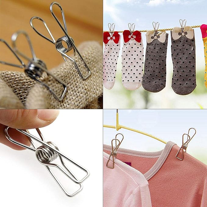 Skroad洗濯バサミ、防錆洗濯バサミ ステンレス防風洗濯ばさみ 100パック、室内 室外強力グリップ洗濯バサミ、洗濯物干しピンチ 布団干し 物干し シルバー, おやつ袋用ハンガーバサミ、タオル、写真、紙、キッチン、オフィス 洗濯用品 物干し多用途1