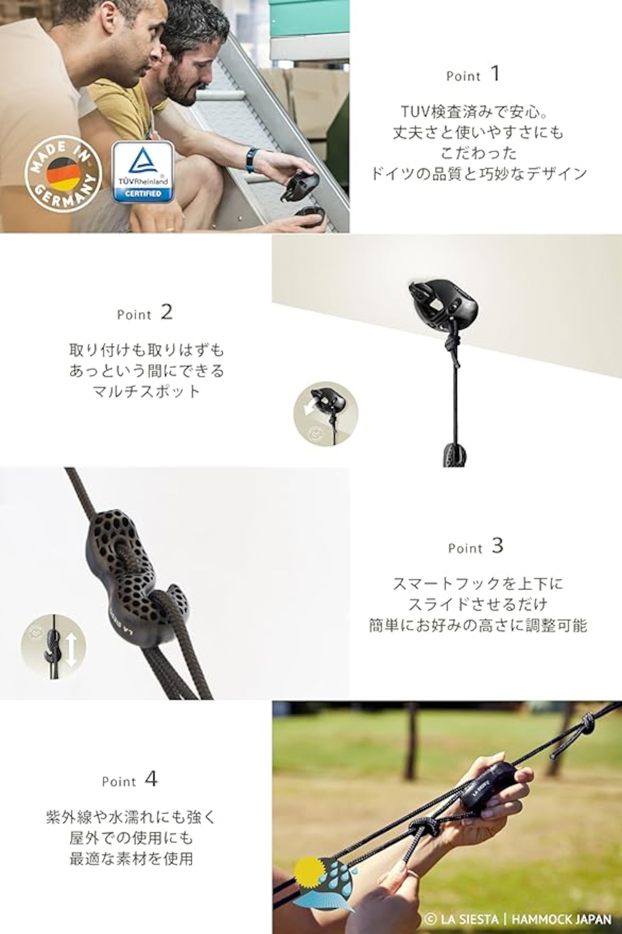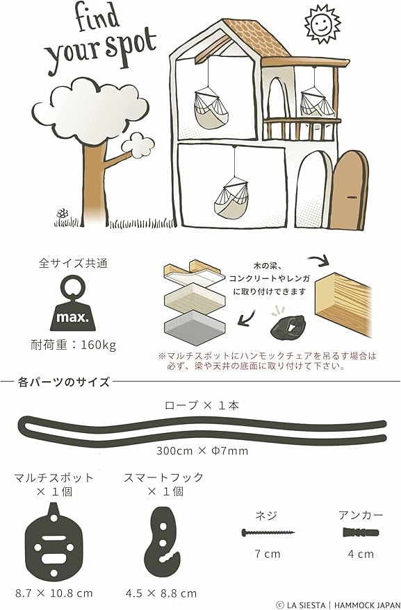 【この商品について】 ハンモックチェアを天井や梁などに打ち付け、固定してお使いいただく際の取付具です。 フォーム(マルチスポット)は4箇所で固定するため負荷の分散は理想的です。 ハンモックチェアの取り付け・取り外しがとっても簡単スマートフックは、アジャスター機能も兼ねていてロープを通したスマートフックをスライドさせるだけでロープの長さ調整も自由自在です。 そのため、乗る方に合わせた高さ調整も簡単にして頂けます。(お子様は身長に合わせて低めに設定いただくと安心してお乗りいただけます) このセットは