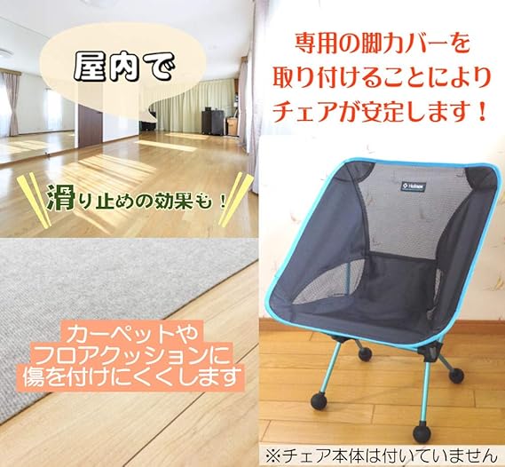長野アウトドアスタイルが作ったヘリノックスチェアシリーズ専用のボールフィートの互換商品です。 チェアの脚に取り付け、砂地などの柔らかい地面で脚を沈み込みにくくします。 また、フローリングの床やカーペットが傷つくのを防ぎ、使用中に椅子が滑るなど、滑り止めの効果もあります。