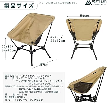 ヴァストランド VASTLAND コンパクトキャンプフィットチェア 高さ4段階調節 折りたたみ キャンプ 椅子 ローチェア1
