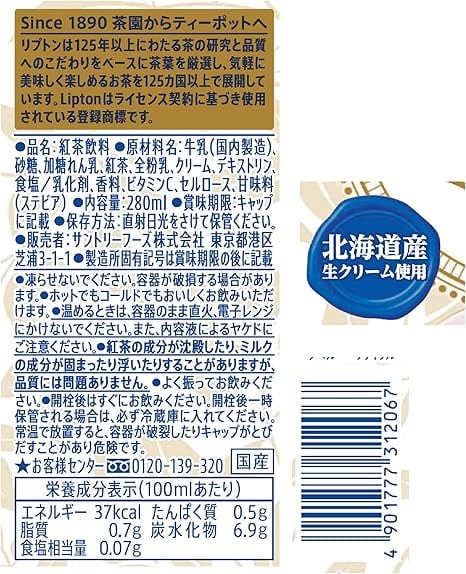 原材料:牛乳(国内製造)、砂糖、加糖れん乳、紅茶、全粉乳、クリーム、デキストリン、食塩/乳化剤、香料、ビタミンC、セルロース、甘味料(ステビア)