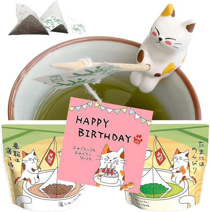コップのフチにちょこんと座る可愛い猫のフィギュア「みたらしちゃん」付きティーバッグセットです。猫好き、お茶好きなお友達やご両親へのお誕生日プレゼントに、美味しく、楽しい「ねこのティーバッグセット」はいかがですか?猫ちゃんの可愛いメッセージ(HAPPY BIRTHDAY)