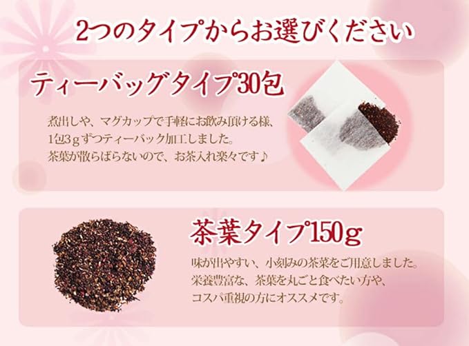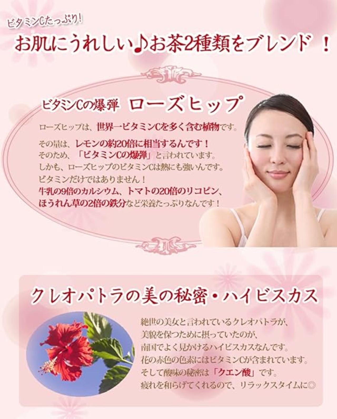 原材料:ローズヒップ(チリ産)・ハイビスカス(エジプト又はスーダン産) 原産国:日本