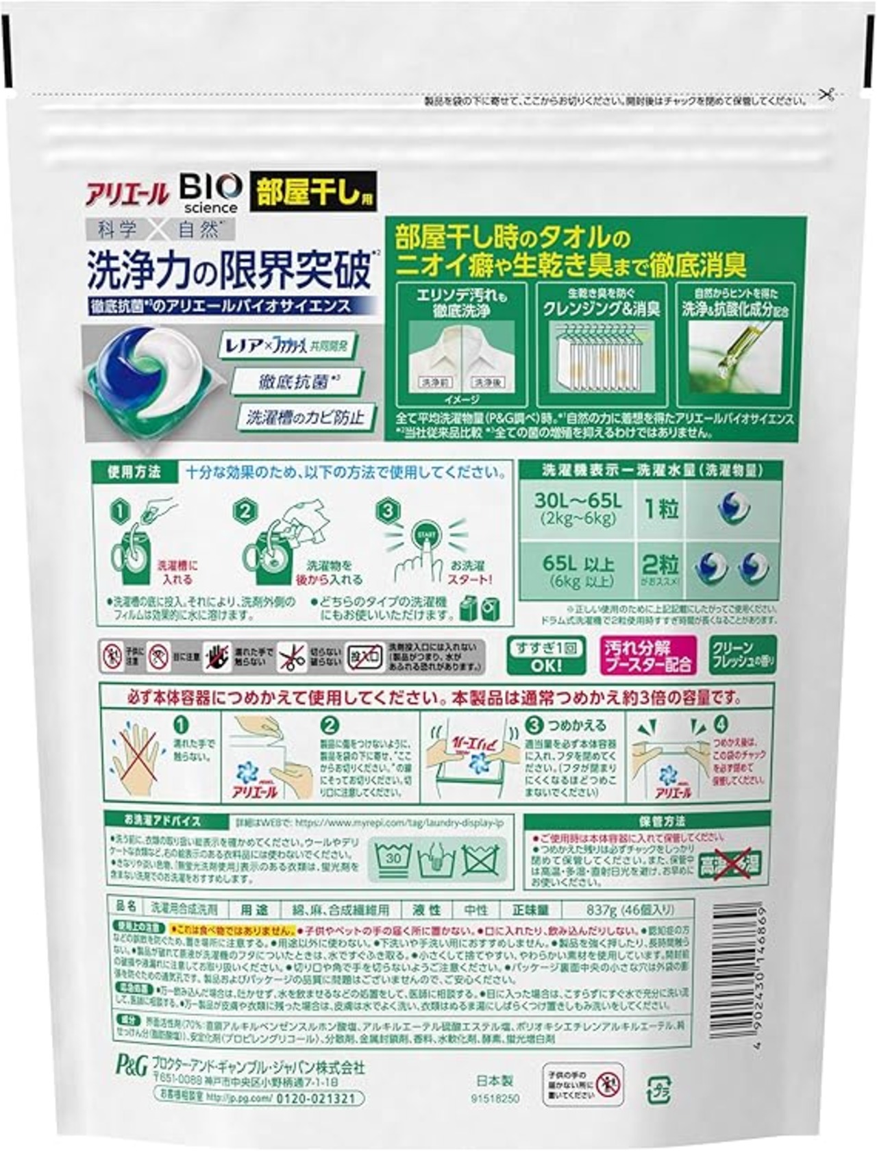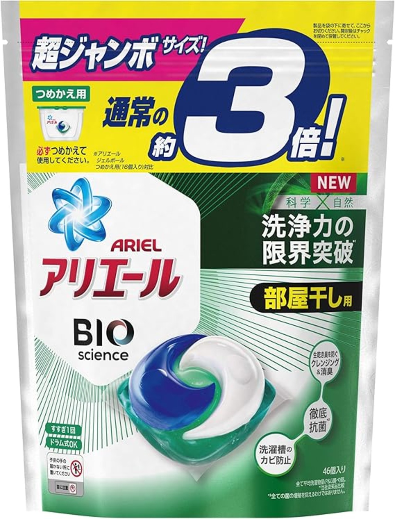 アリエール バイオサイエンス 部屋干し 洗濯洗剤 ジェルボール 抗菌&菌のエサまで除去 詰め替え 大容量 46個(約3倍) 1袋