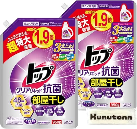 ライオン LION トップ クリアリキッド抗菌 部屋干し 液体洗剤 つめかえ用 超特大 950g 洗たく用 洗剤 2袋セット + Kunutonnオリジナルロゴ入りhおしぼり付