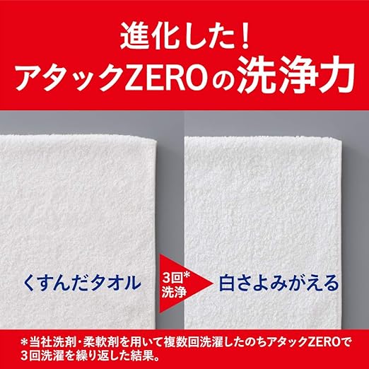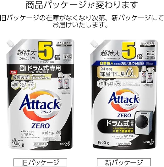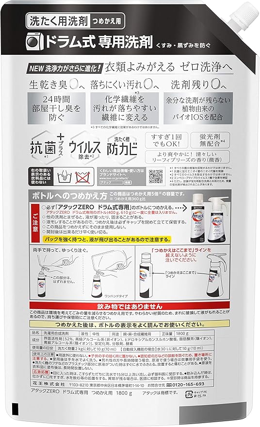 【大容量】アタック ゼロ(ZERO) 洗濯洗剤(Laundry Detergent)ドラム式専用 くすみ・黒ずみを防ぐ 詰め替え 1800g (清潔実感! 洗うたび白さよみがえる)