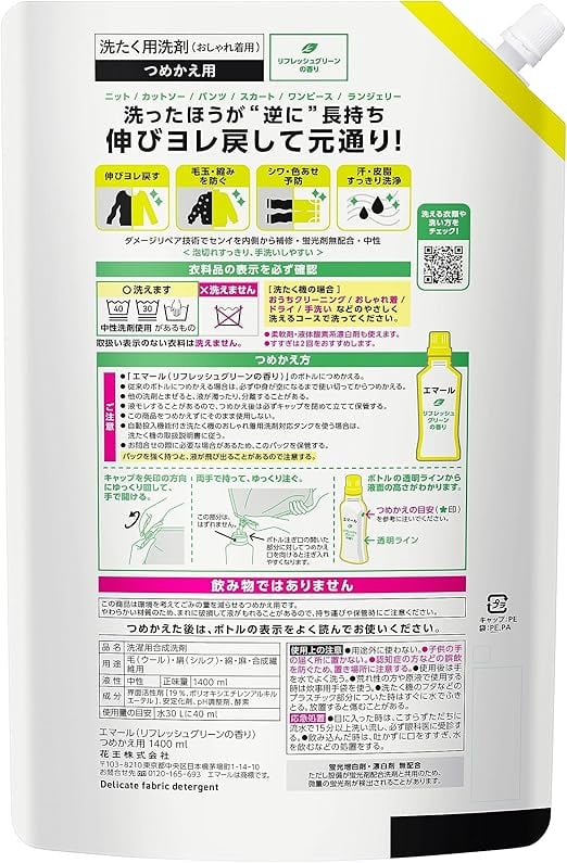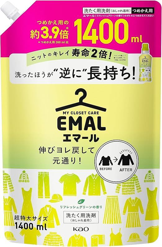 【大容量】エマール 伸びヨレ戻して元通り、洗ったほうが、逆に長持ち! リフレッシュグリーンの香り 詰替え用 1,400ml