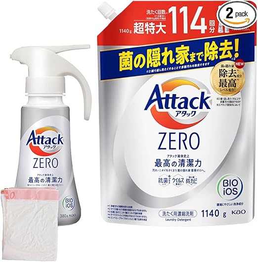 【セット買い】 アタック ZERO ゼロ 洗濯洗剤 液体 アタック液体史上 最高の清潔力 ワンハンドタイプ本体380g×1個 + 詰め替え1140g×1個 + ひも付きゴミ袋×1枚